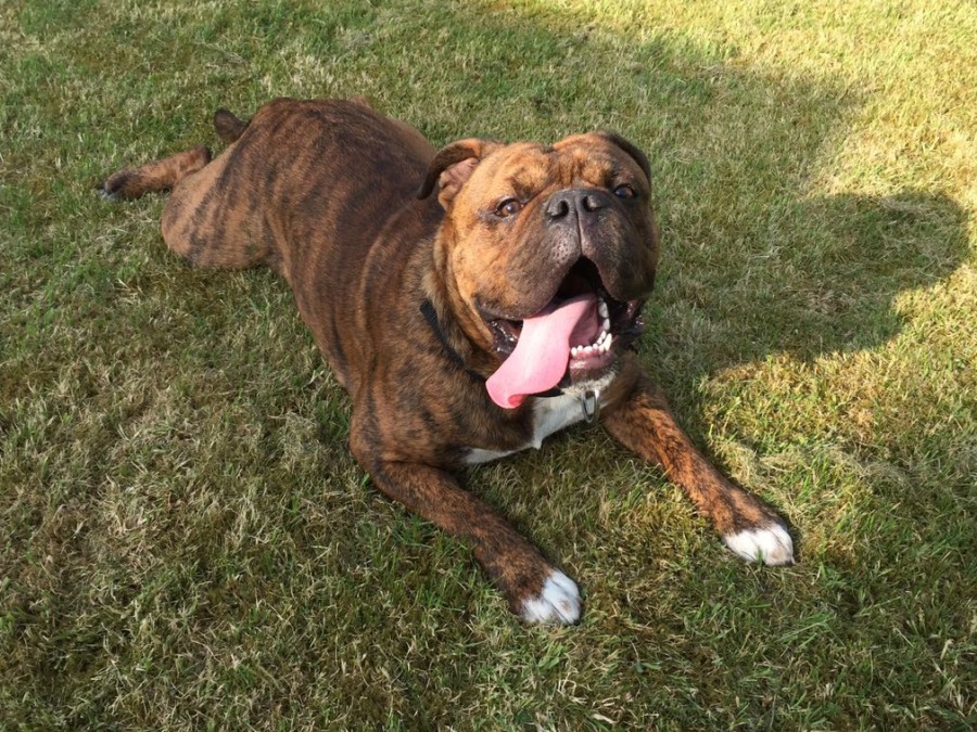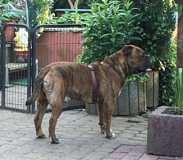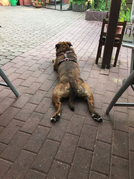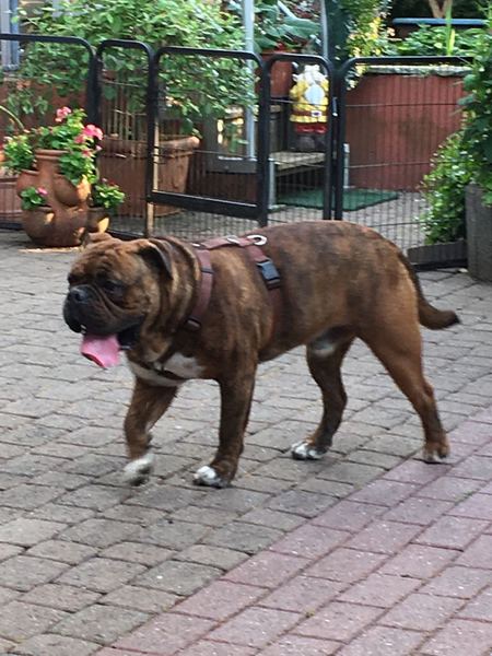 das ist Aramon ( 3 Jahre, Kastriert ) ein Leavitt Bulldog aus unserem ersten Wurf. Er muss leider sein Zuhause verlassen da er sich nicht mit dem Neugeborenen der Familie versteht, er ist sehr eifersüchtig dem Baby gegenüber so das es für die Eltern nicht möglich ist ihn zu halten.